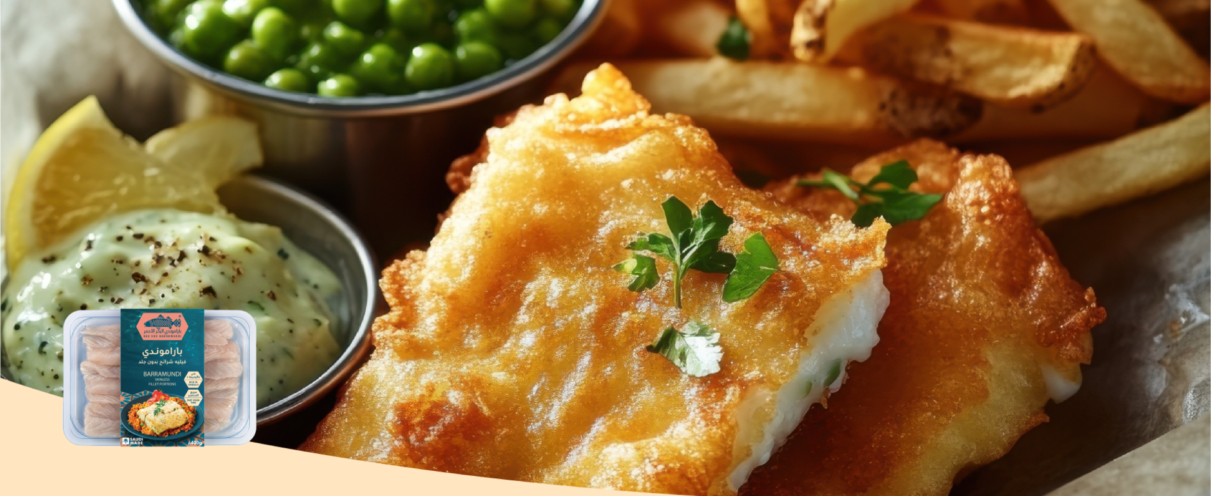 - قدميه مع البطاطس المقلية وصوص التارتار وشرائح الليمون.