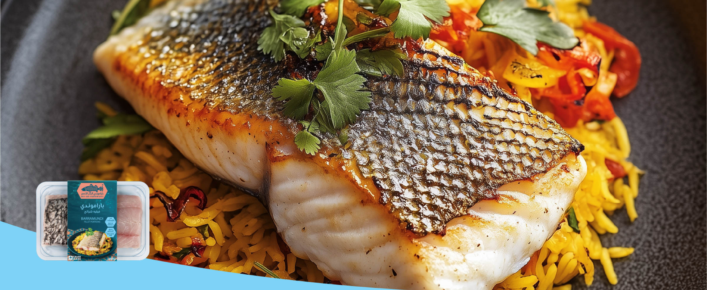 - Plate the rice, top with baked Red Sea Barramundi and garnish with cilantro, raisins and almonds